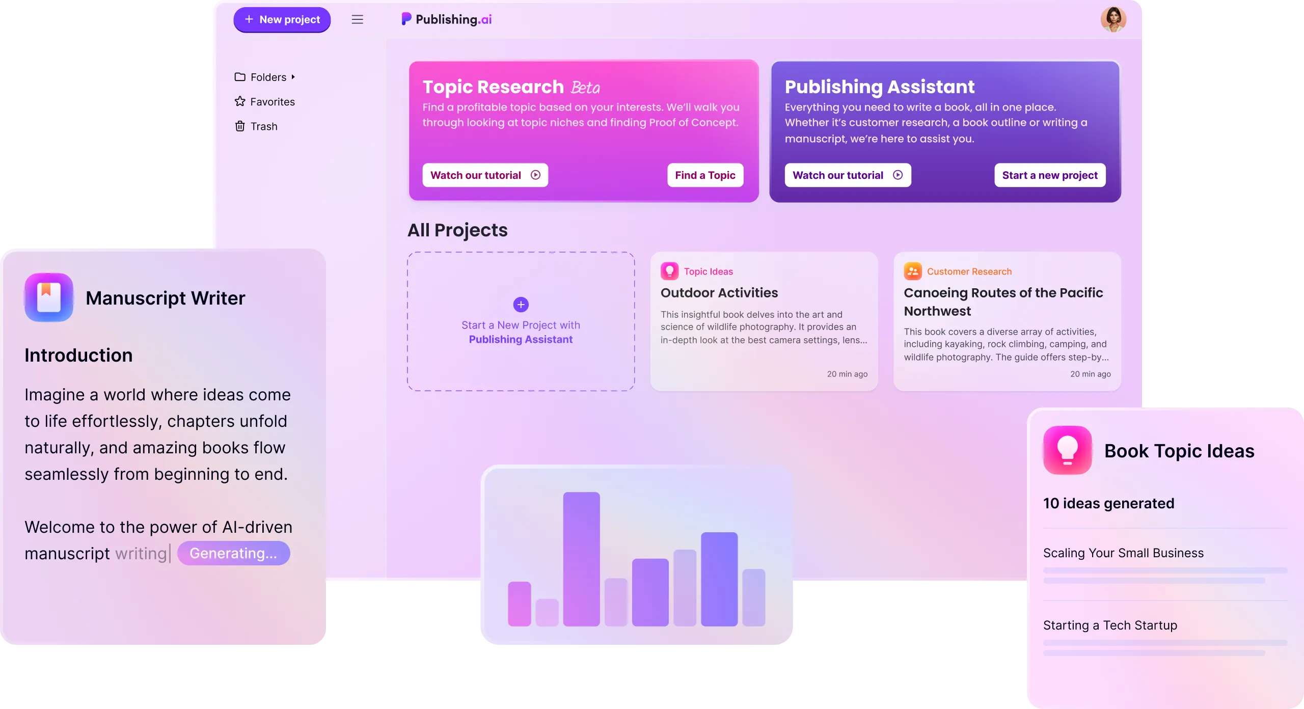 AI-powered self-publishing platform helping authors generate and refine full manuscripts, supported by a comprehensive dashboard and automation tooling.